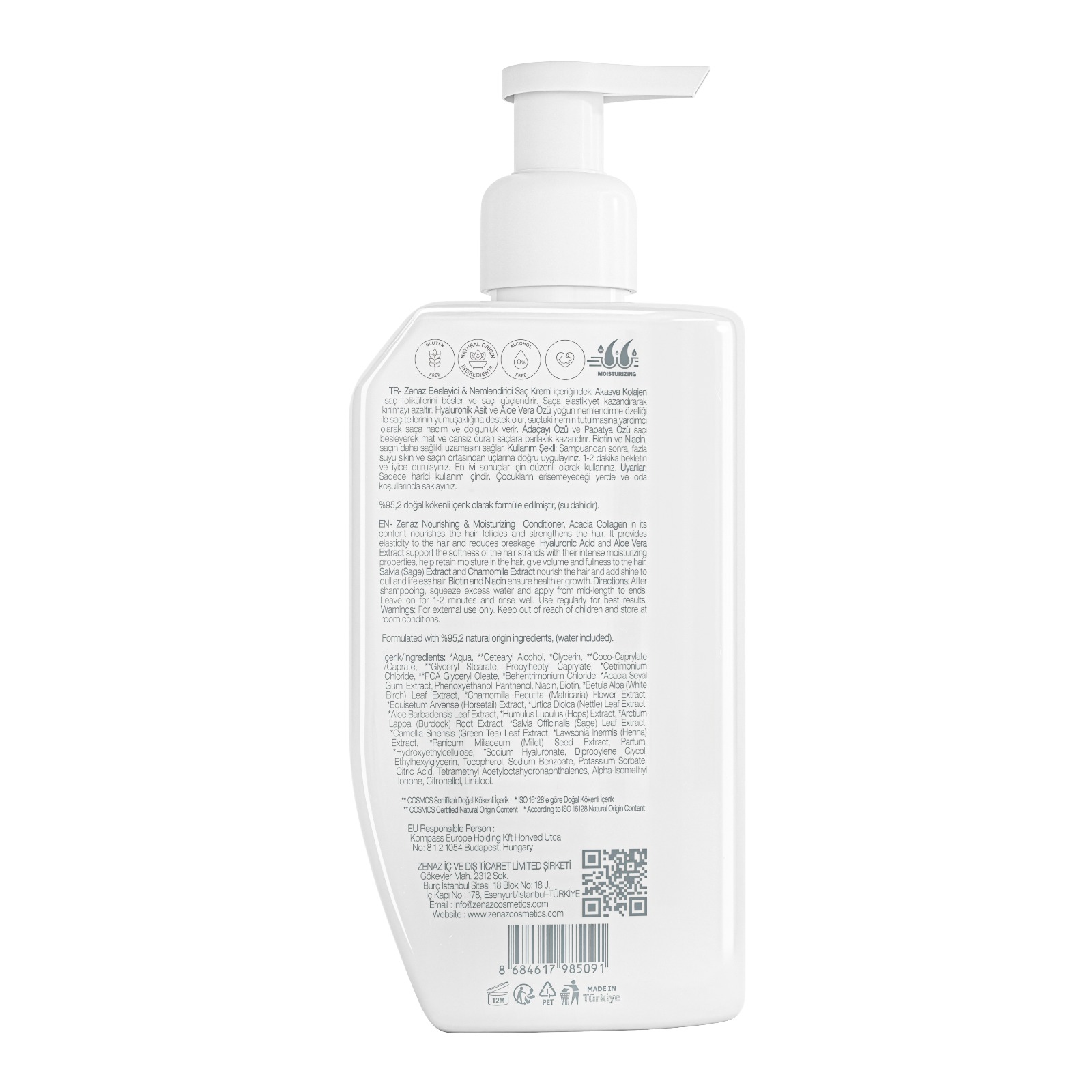 Zenaz Nourishing & Moisturizing Hair Conditioner “Acacia Collagen in its content nourishes the hair follicles and strengthens the hair. It provides elasticity to the hair and reduces breakage. *Hyaluronic Acid and “Aloe Vera Extract sup- port the softness of the hair strands with their intense moisturizing properties, help retain moisture in the hair and give volume and fullness to the hair. *Salvia (Sage) Extract and *Chamomile Extract nourish the hair and add shine to dull and lifeless hair. Biotin and Niacin ensure healthier growth.